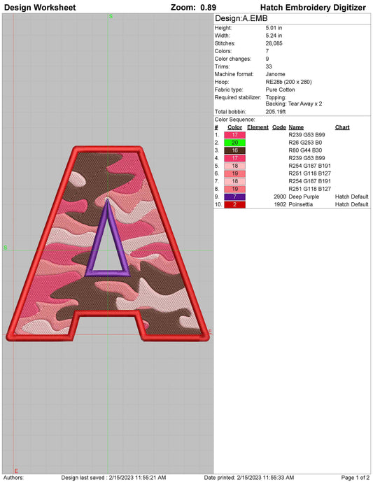 CAMO Embroidery Alphabet (A to Z) 5 Inch PES Format